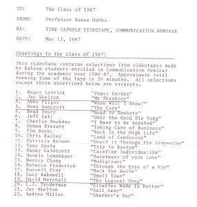 just unearthed the “time capsule” that the class compiled and found the videotape I shared with the class, a compilation excerpt tape of 22 music videos produced by students enrolled in Communication Seminar in the Fall of 1986 and Spring of 1987.